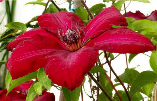 Clematis kvete krásnými sametovými květy. Jedná se o velké exempláře o průměru 16 centimetrů a se 6 okvětními lístky. Okvětní lístky jsou oválné, podlouhlé, není na nich froté. Jsou namalovány jasně červeným tónem, ale uprostřed každého okvětního lístku je světlý pruh. Někdy se také objevuje rozptyl světla ve středu. Tyčinky jsou bílorůžové a prašníky fialové. Jsou umístěny na světle žlutých nitích, které tvoří půlkruh.
