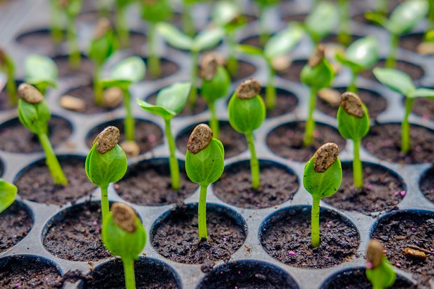 Naplňte nádoby směsí rašeliny, písku a humusu v poměru 50:25:25 procent. Pro kypření půdy můžete do půdy přidat trochu vermikulitu nebo perlitu. Směs v květináčích dobře uhlaďte a zhutněte lžící nebo dnem sklenice. Na povrch položte semínko: jedno semínko do nádoby, usnadní to přesazování do otevřené půdy nebo skleníku. Navrch přikryjte 2centimetrovou vrstvou zeminy. Znovu zhutněte lžící: půda by měla na semena vyvíjet stejný tlak z obou stran.
