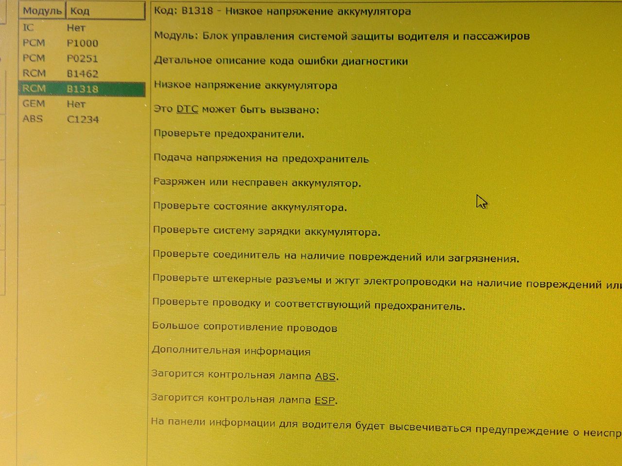 Vůz je Ford Focus1, 2005. Při jízdě nad 20 km/h se rozsvítí kontrolka ABS a vykřičník, ABS nefunguje. V nižších rychlostech vše funguje v pořádku, přístroj ukazuje, že senzory fungují na všech kolech, nesvítí ABS a vykřičník. Diagnostika ukázala chybu B1318 – nízké napětí baterie. Při brzdění nebo vypnutí zapalování světla zhasnou, ale ne vždy (pouze při odpojení baterie – vždy). Diagnostikové říkají, že je jednotka ABS rozbitá, ale ten, kdo opravuje jednotky ABS, říká, že to nemusí být problém. Vyměnil jsem jednotku ABS (mám ji od demontáže), jednotka funguje, ale problém přetrvává. V důsledku všemožných machinací (výměna jednotky ABS, výměna destiček, výměna ruční brzdy atd.) se problém nevyřešil, jen jsem utratil spoustu peněz. A pak jednoho krásného slunečného dne, hoorayaaaaaaaaa. Konečně začala kontrolka ABS a vykřičník nepřetržitě hořet. Šel jsem ke stejnému elektrikáři a problém byl odhalen. Uvnitř opletení, které jde do bloku, bylo zjištěno přerušení drátu (ten k zemi). Problém vyřešen.