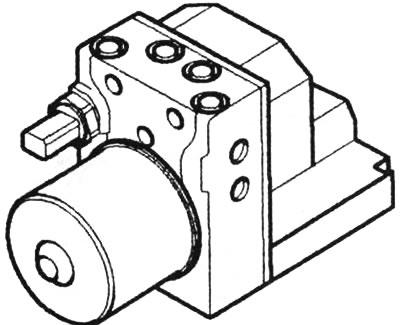 Hydraulický blok. Hlavní část protiblokovacího brzdového systému. Tato jednotka je přišroubována k řídicí jednotce a lze ji oddělit pouze po demontáži. Jednotka obsahuje elektrické čerpadlo a ventilový blok s elektromagnetickými ventily. Pokud se protiblokovací brzdový systém spustí, řídicí jednotka vydá povel ke snížení tlaku v brzdovém pohonu. Brzdová kapalina proudí z ventilového bloku přímo do expanzní nádrže. Pokud tlak v brzdovém pohonu opět vzroste, je brzdová kapalina z nádrže přiváděna přímo do odpovídajícího brzdového okruhu přes hydraulické čerpadlo. Činnost čerpadla je patrná podle brzdového pedálu – pedál začne mírně pulzovat.