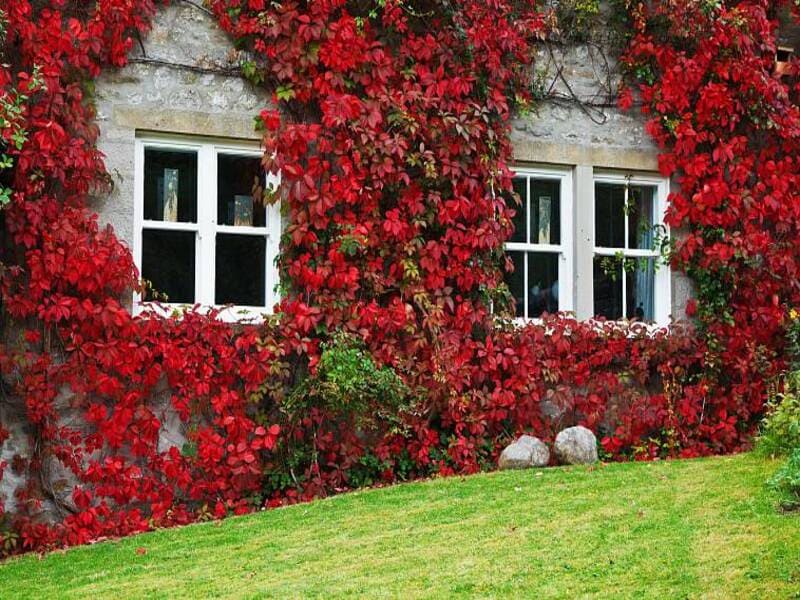 Dekorativní keře: břečťan, hortenzie, javor, jedle, plamének, panenské hrozny, dekorativní borovice.